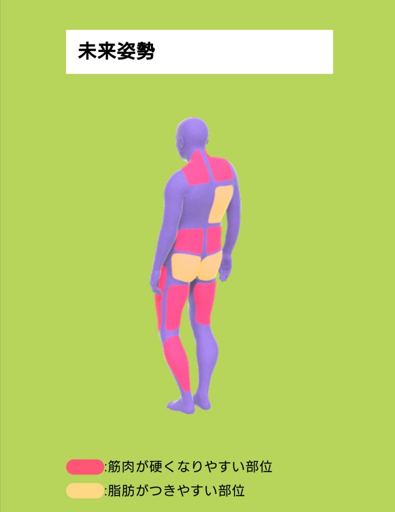 さらにさらにそこから3D画像で【未来の姿勢】が出て、筋肉が硬くなりやすい部分や脂肪がつきやすい部分がわかります!!