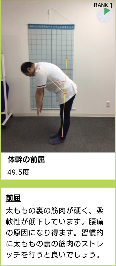 これだけで姿勢の傾きや身体を曲げた時の角度などでて、さらに何が原因で体が硬いのか?など分析結果として出ます!