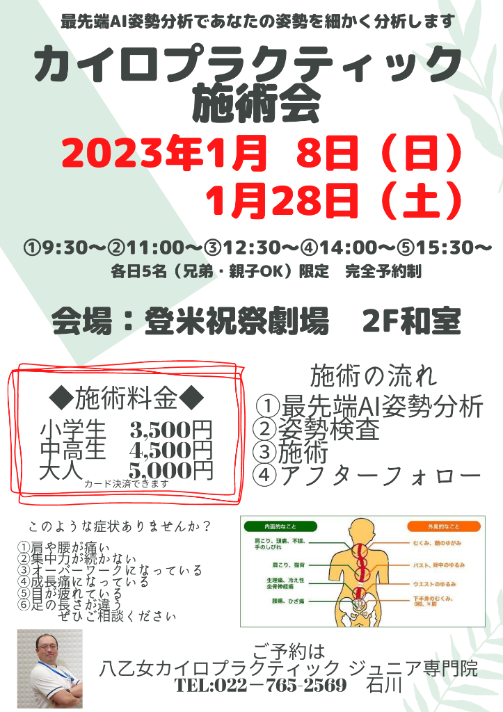 1月8日(日)、28日(土)は、登米祝祭劇場にて出張施術会を行います。