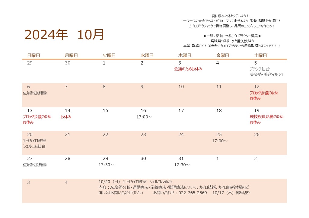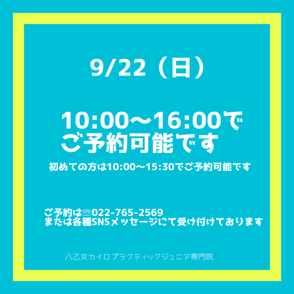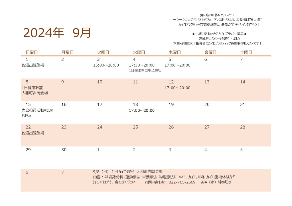 八乙女カイロプラクティックジュニア専門院9月営業カレンダーです!!